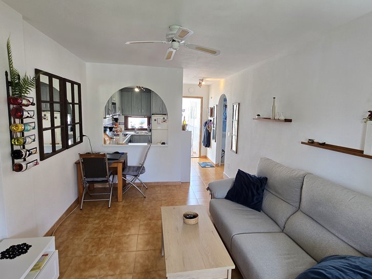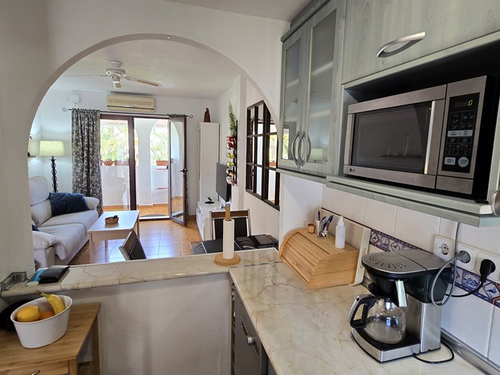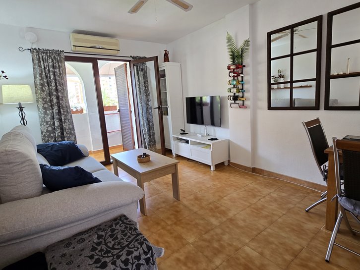 GRAN OPORTUNIDAD!! Hermoso apartamento junto a los dos mares​ con 2 terrazas, una junto a la cocina y otra junto al salón, que proporcionan ventilación cruzada.​ Tiene 1 dormitorio, 1 baño, cocina americana​ y salón comedor. Ha sido reformado, ​con mejoras como puerta de seguridad, ventanas climalit, mosquiteras, toldo, aire acondicionado y ventiladores de techo. La cocina es completamente nueva, con electrodomésticos de alta calidad. Se vende ​t​otalmente amueblado​ y equipado. Zonas comunitarias con 2 piscinas, jardín y pista de tenis. ​Amplia variedad de comercios en la zona.