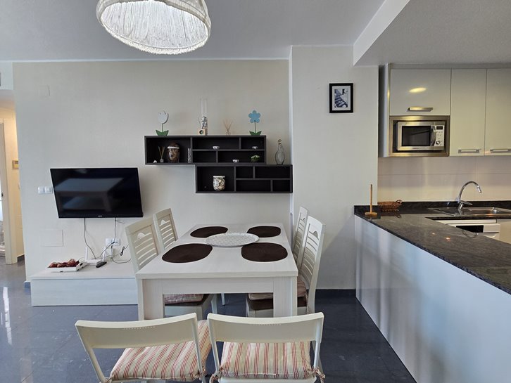 Magnificent apartment located in the prestigious Mar Azul urbanization, in the northern area of La Manga del Mar Menor. It consists of an entrance hall, living-dining room, open-plan kitchen, 2 bedrooms (one en suite) and 2 bathrooms. From its comfortable terrace you can enjoy beautiful views of the Mar Menor, as well as incredible sunsets. The complex features swimming pools and a solarium, and is situated next to the expansive Mediterranean beaches and just 20 meters from Veneciola beach on the Mar Menor. Parking space number 65 is located in the basement.