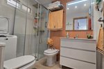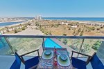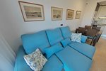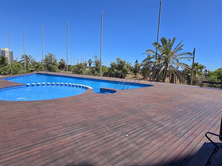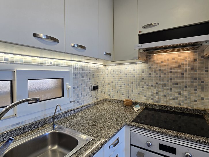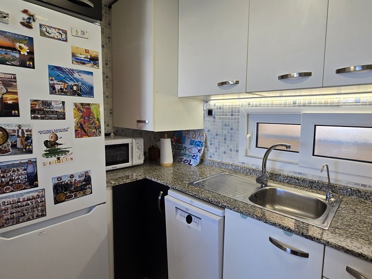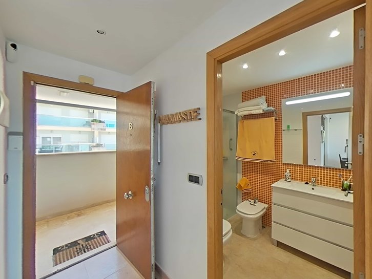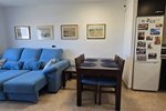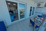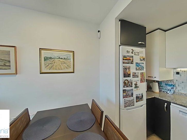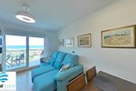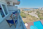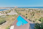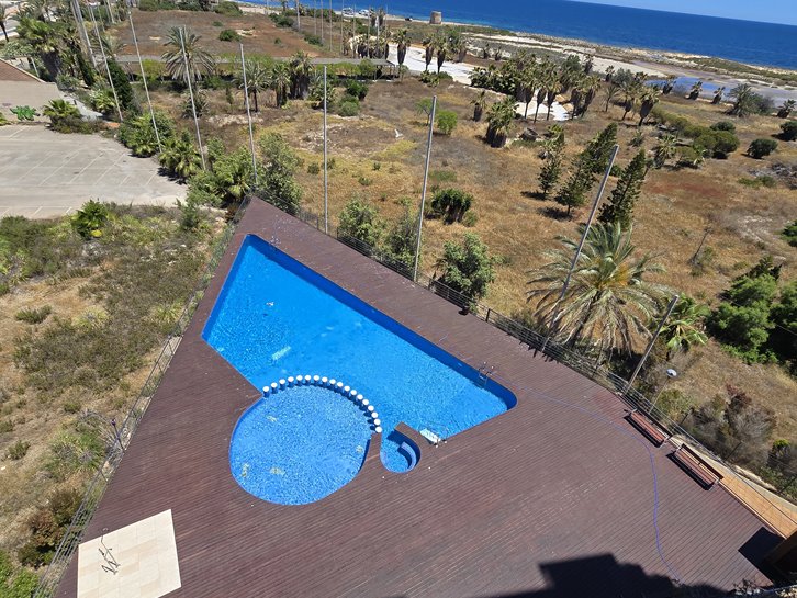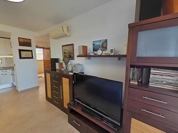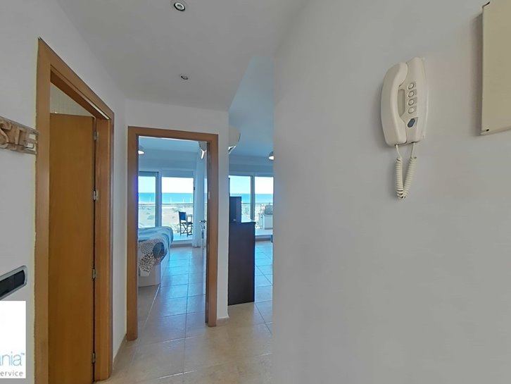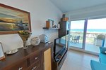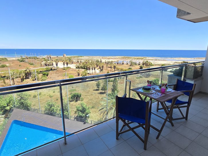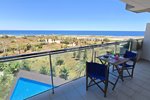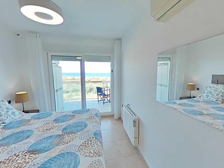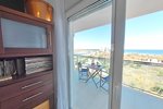 Beautiful and comfortable apartment on the 5th floor, with a large terrace offering excellent views of both seas and beautiful sunsets. It has an entrance hall, one bedroom, one bathroom, an open-plan kitchen, and a spacious living-dining room. Sold fully furnished and equipped, with ceiling fans, air conditioning, and radiator heating. The communal area includes a swimming pool, outdoor showers, a children's playground, and a paddle tennis court. The development is located next to a large commercial area with a variety of shops. Parking space in basement No. 58.