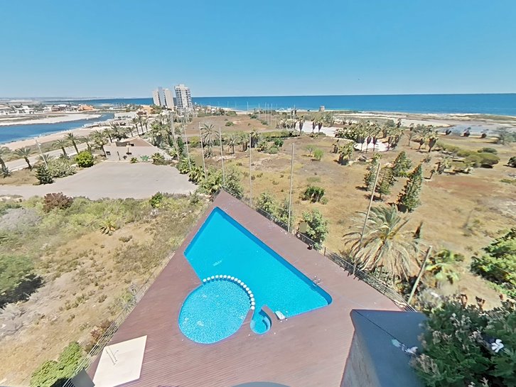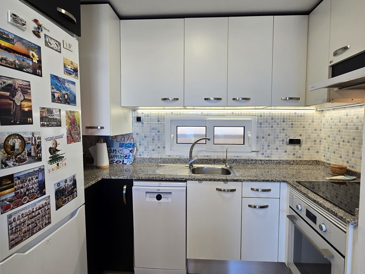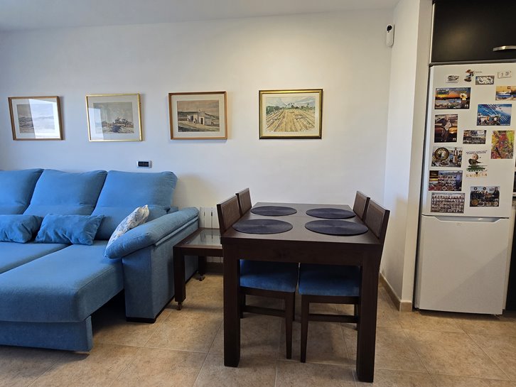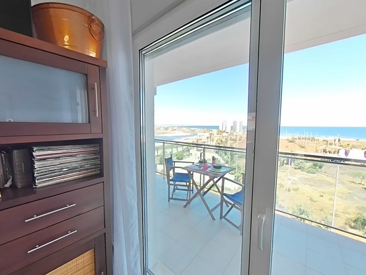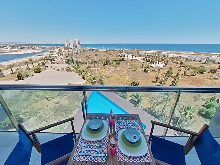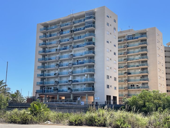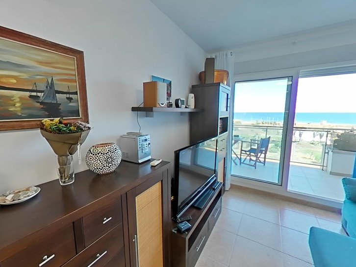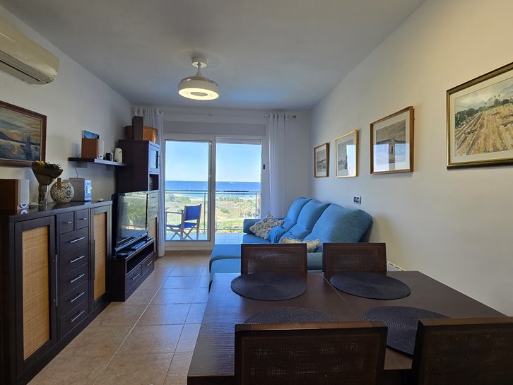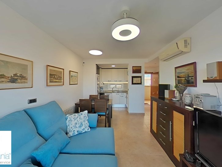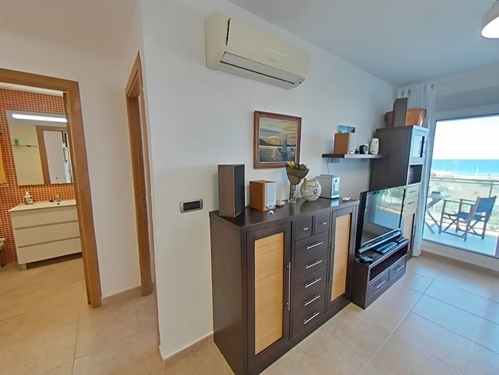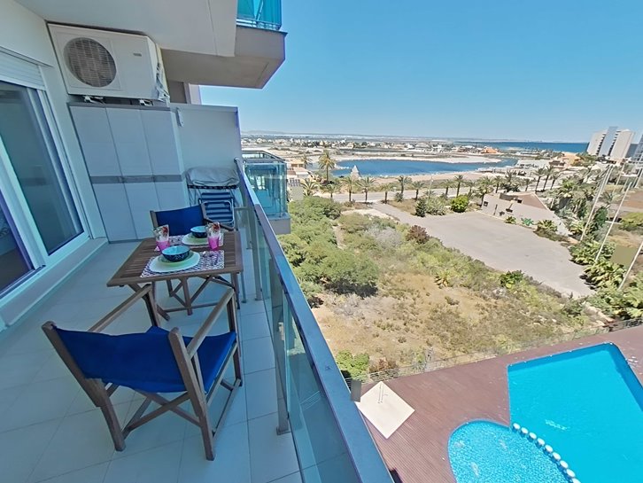 Hermoso y confortable apartamento en la 5ª planta, con una gran terraza donde disfrutar de excelentes vistas a los dos mares y hermosas puestas de sol. Tiene hall de entrada, 1 dormitorio, 1 baño, cocina americana y amplio salón comedor. Se vende completamente amueblado, equipado, con ventiladores de techo, aire acondicionado y calefacción por radiadores. Zona comunitaria con piscina, duchas exteriores, parque infantil y pista de pádel. La urbanización está ubicada junto a una amplia zona comercial, con variedad de comercios. Parking en sótano Nº 58.