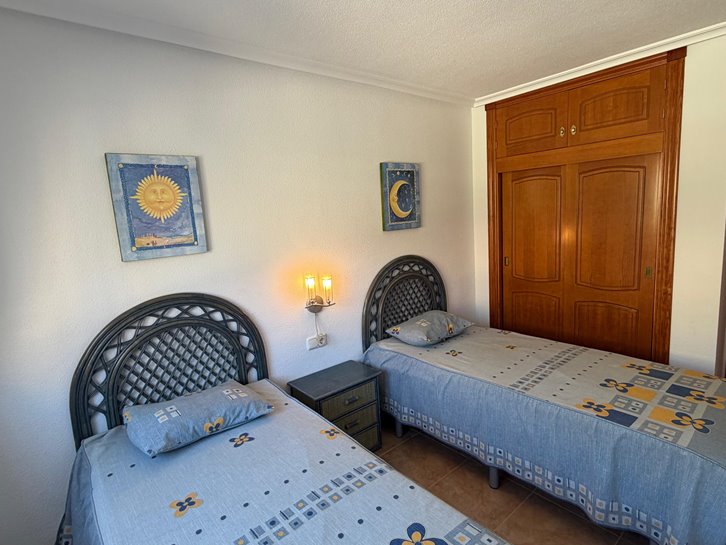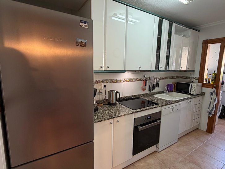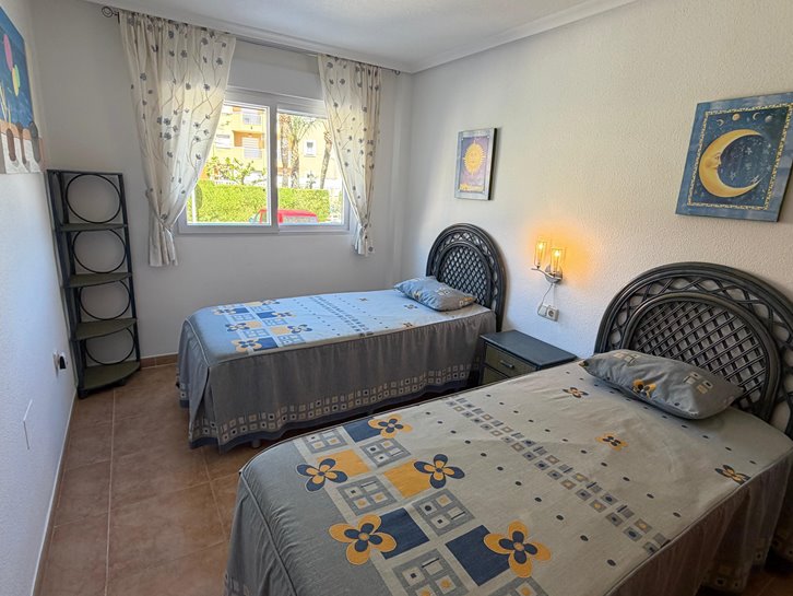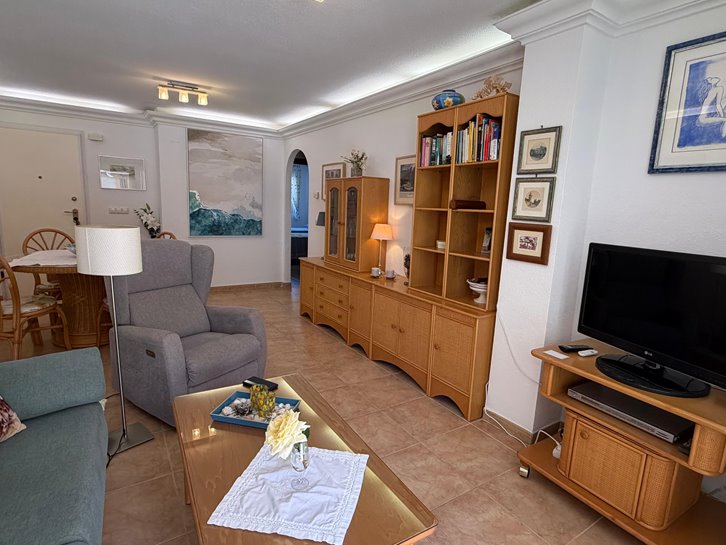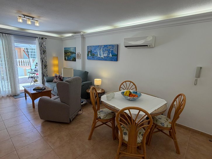 Beautiful ground floor apartment with a large terrace and garden. It has two bedrooms, a renovated bathroom with a shower, a separate kitchen with a utility room, and a comfortable living/dining room. It is sold fully furnished and equipped, and includes air conditioning and underfloor heating. The complex is located next to the Mar Menor, with a wide variety of shops nearby and a communal swimming pool. Garage space number 7 is located in the basement.